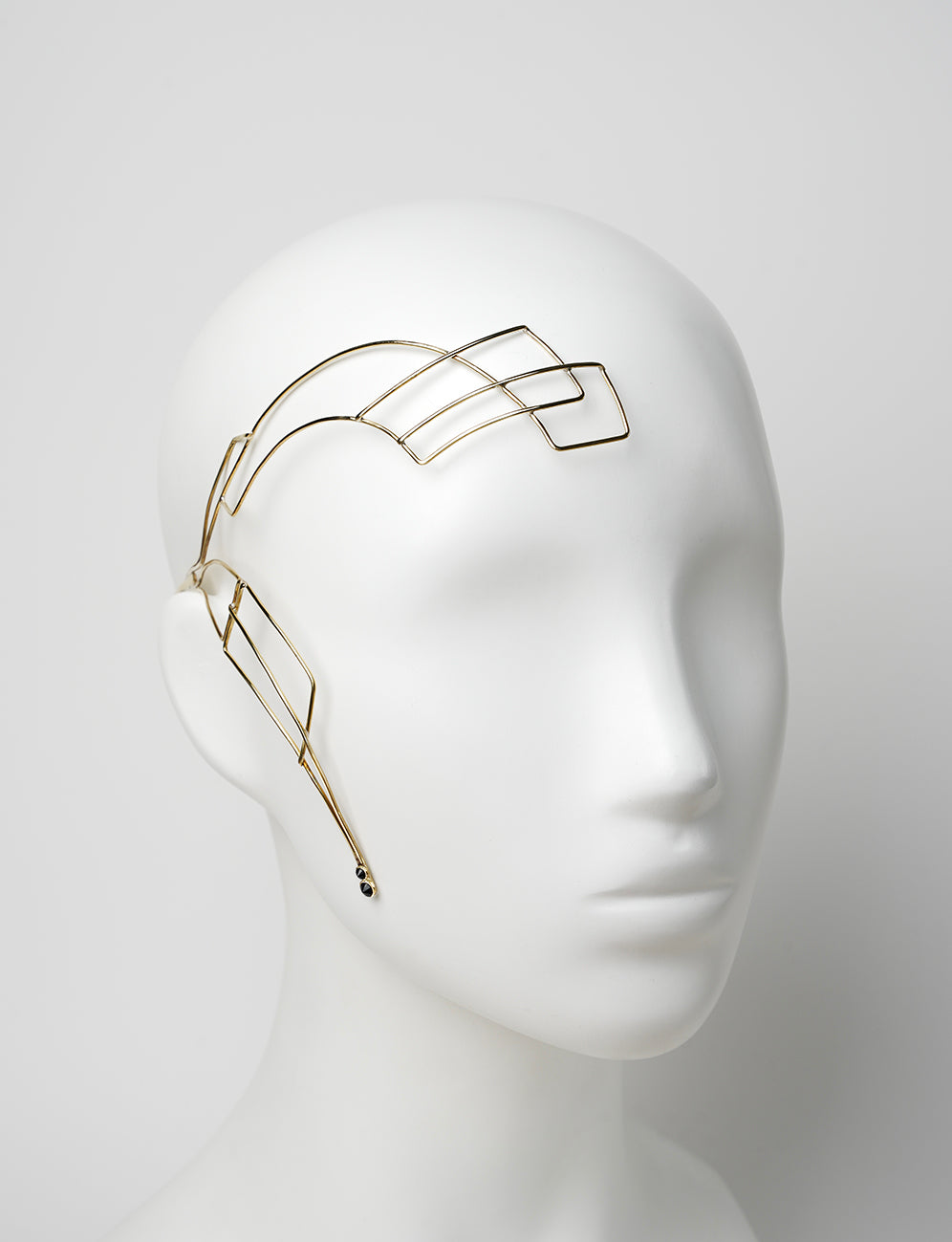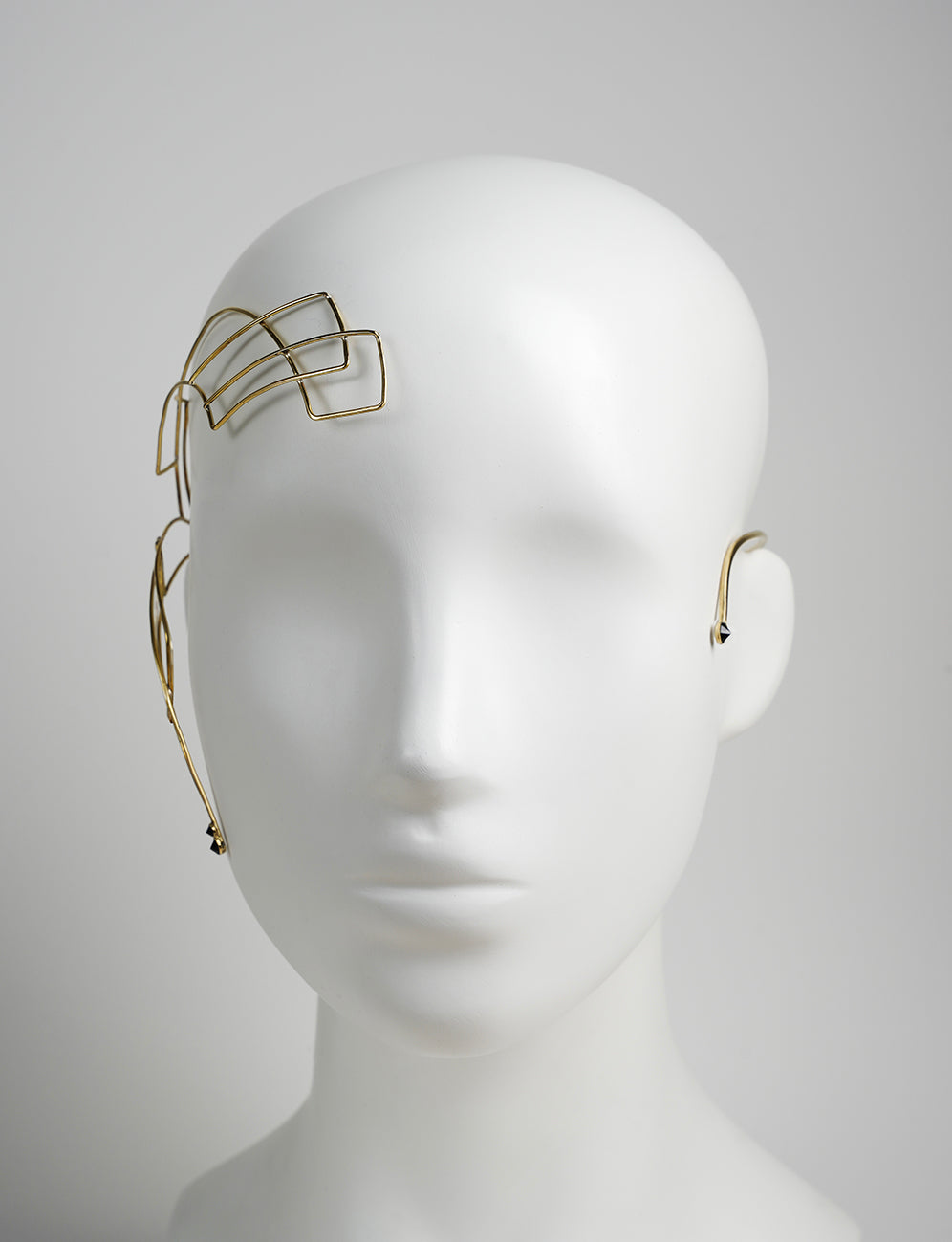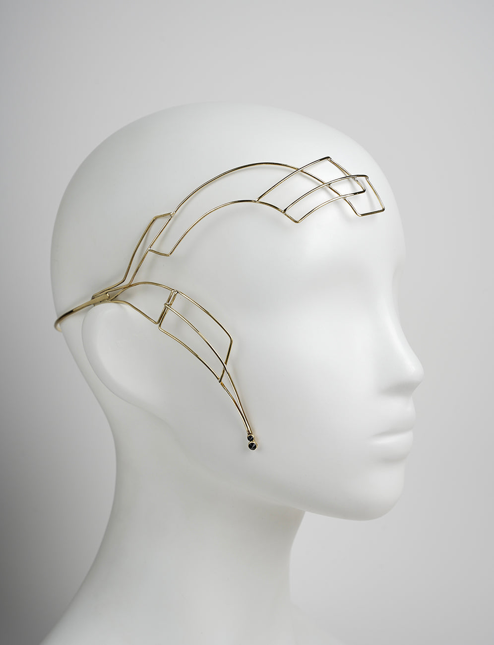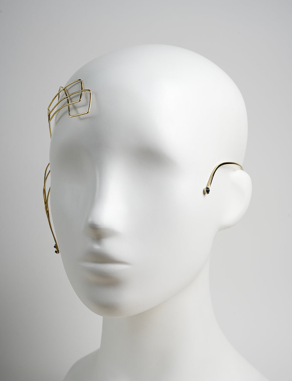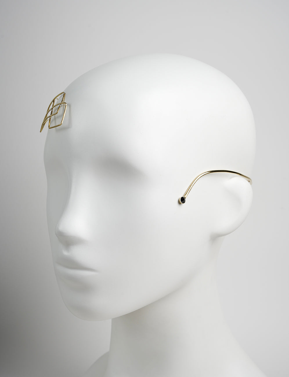 Ornement de tête - Parure de visage dorée. Son axe latéral gauche est profilé d'un design géométrique dont la continuité basse est sertie de deux Zirconium facettés noir. Son côté droit vient se refermer en début de joue avec un nouveau Zirconium facetté.