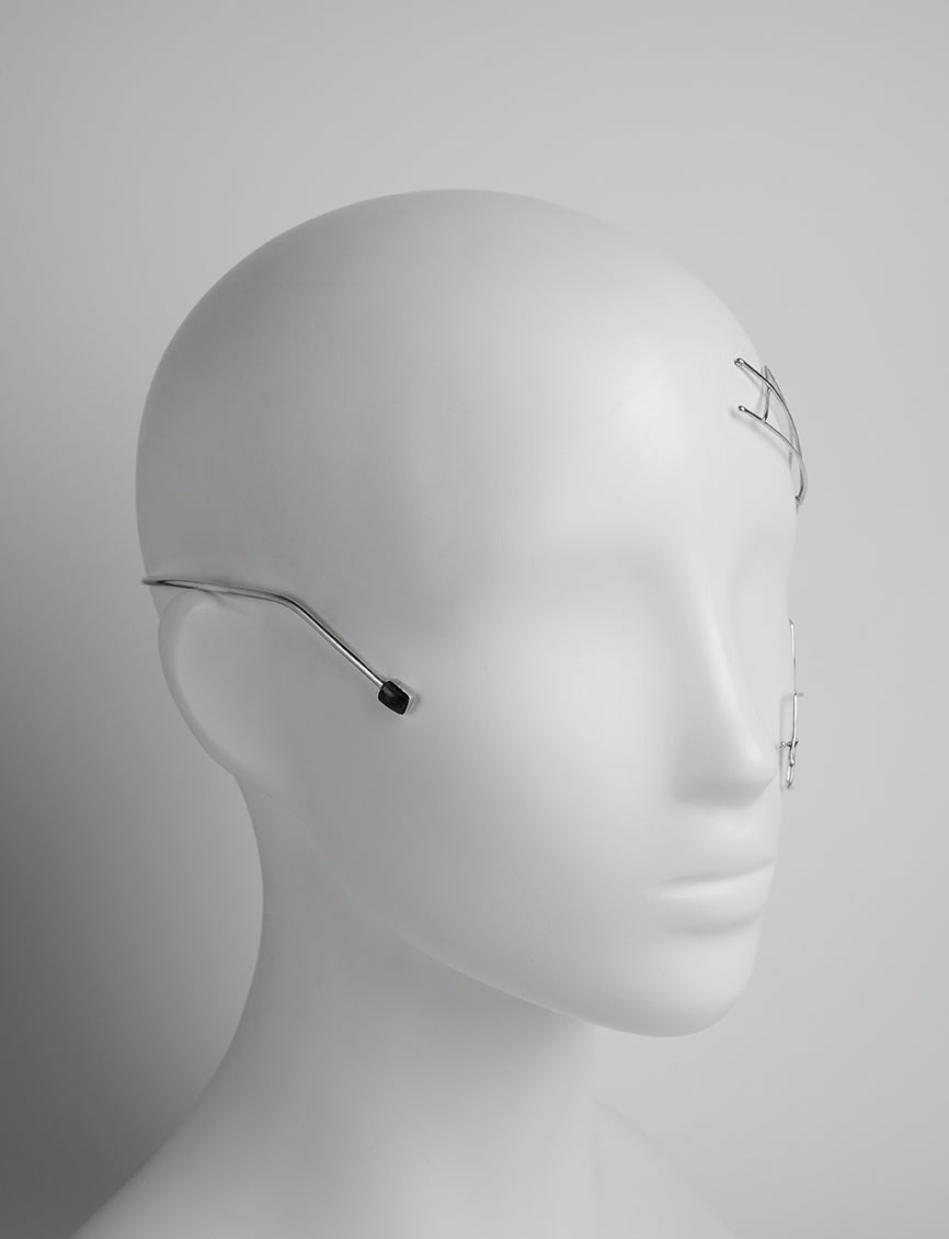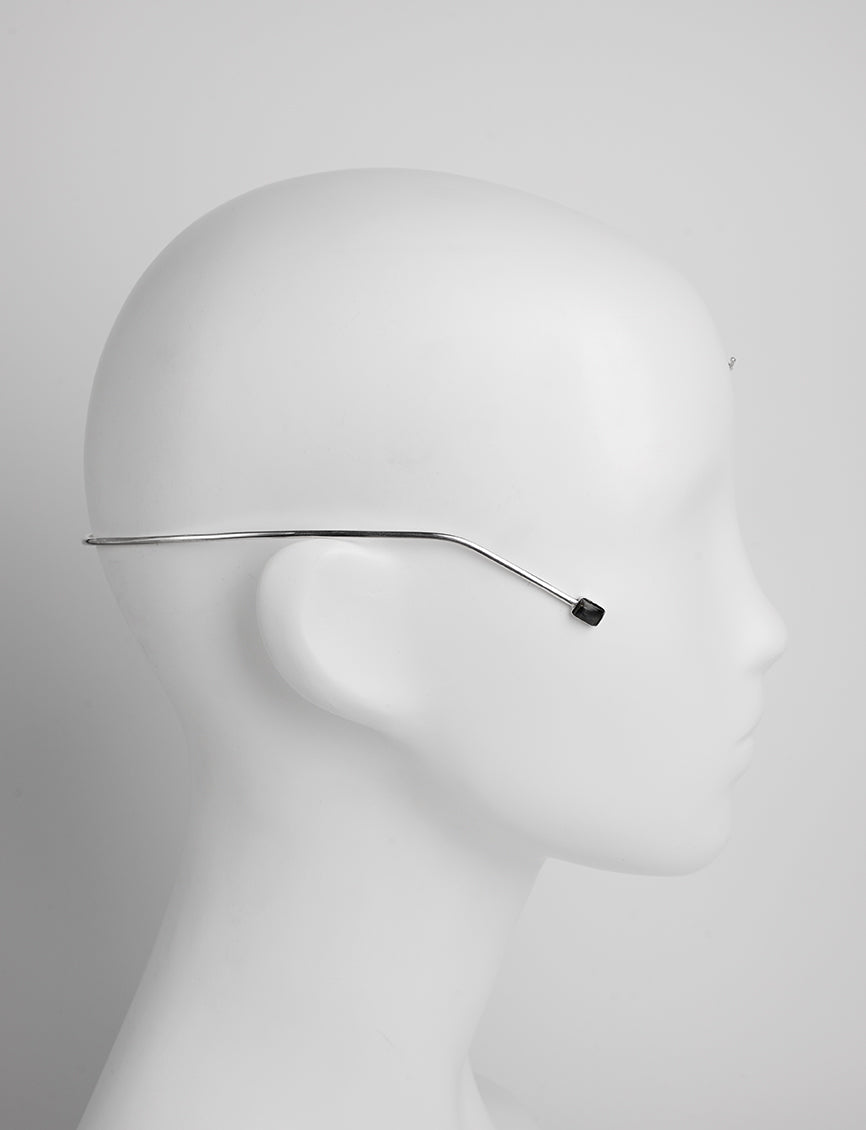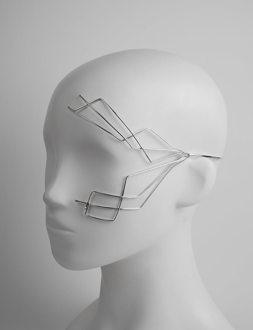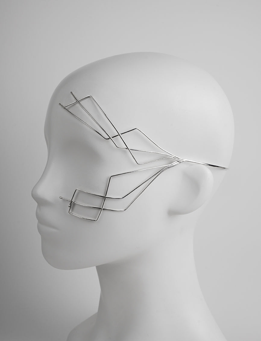 Ornement de tête, Parure de visage dorée, Profilé d’une composition d’une part et d’une Labradorite sertie en argent d’autre part.
